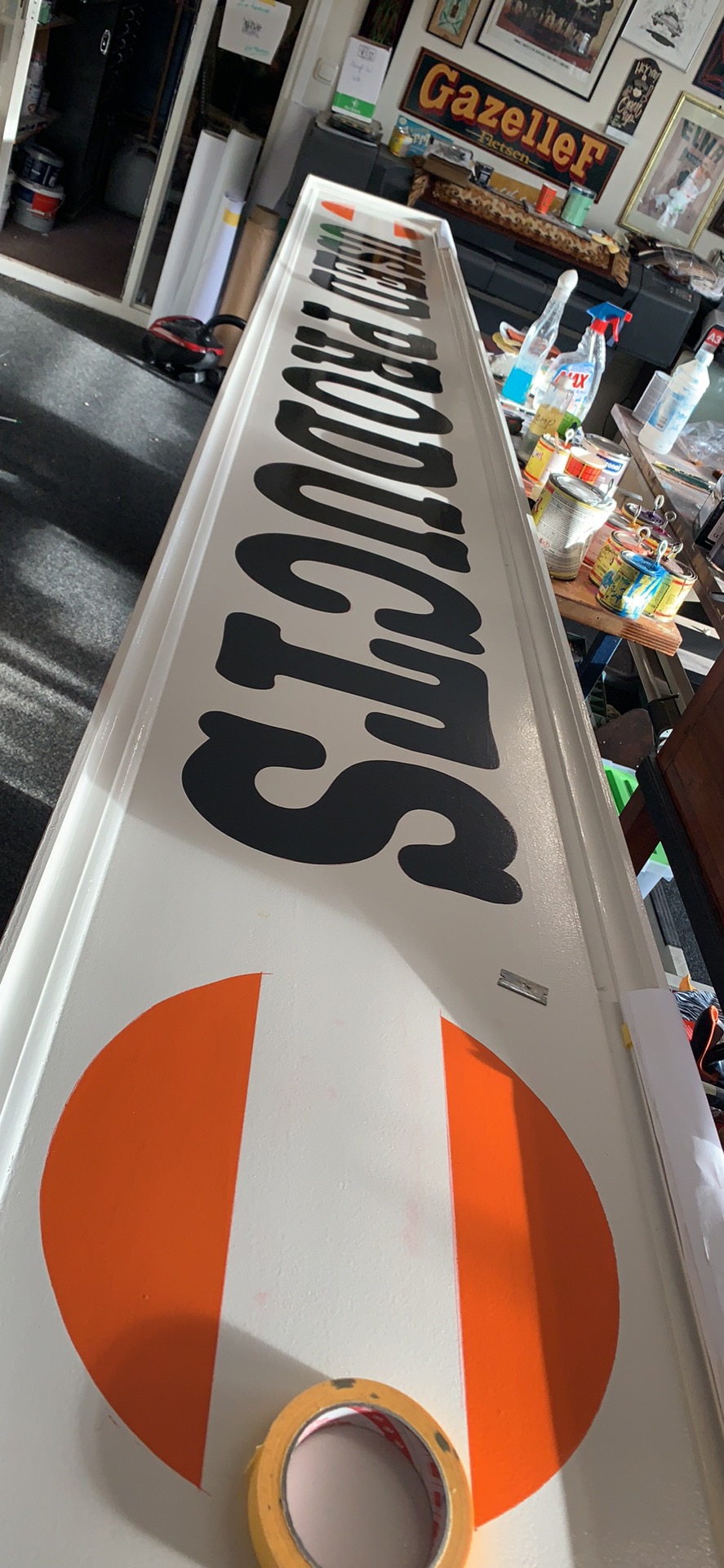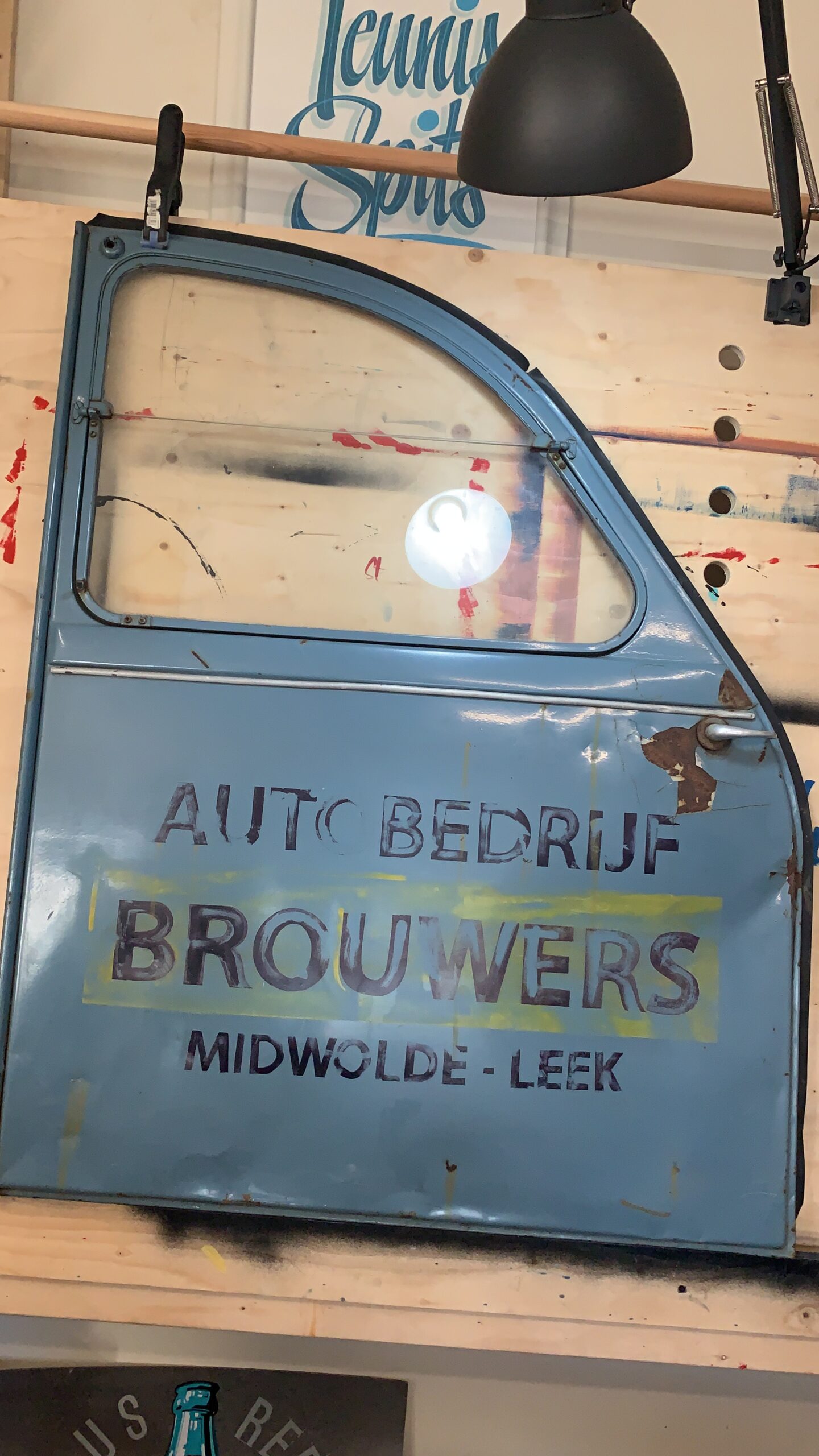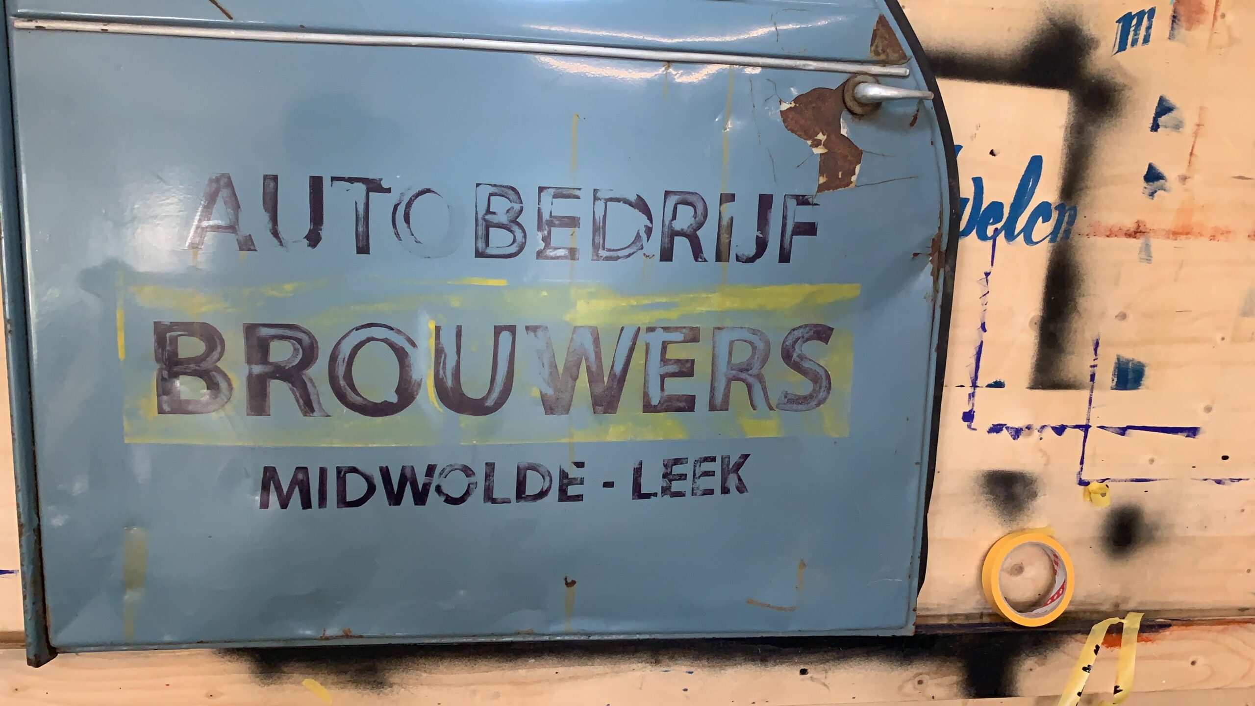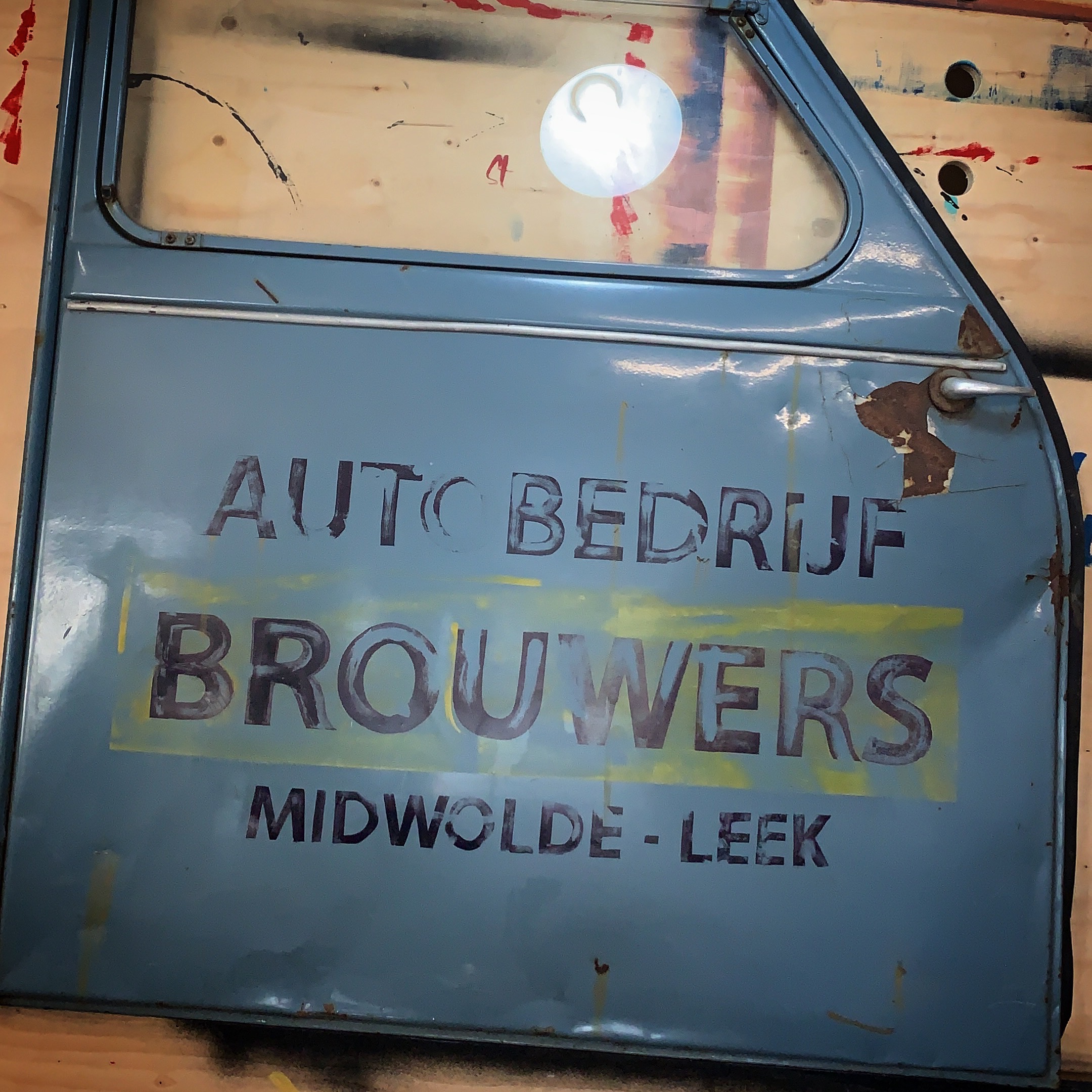 Op verzoek van een klant dit logo op deur van een oud eendje gemaakt. Referentie was een kleine foto via WhatsApp, en de wens dit oud te laten lijken. Missie geslaagd.