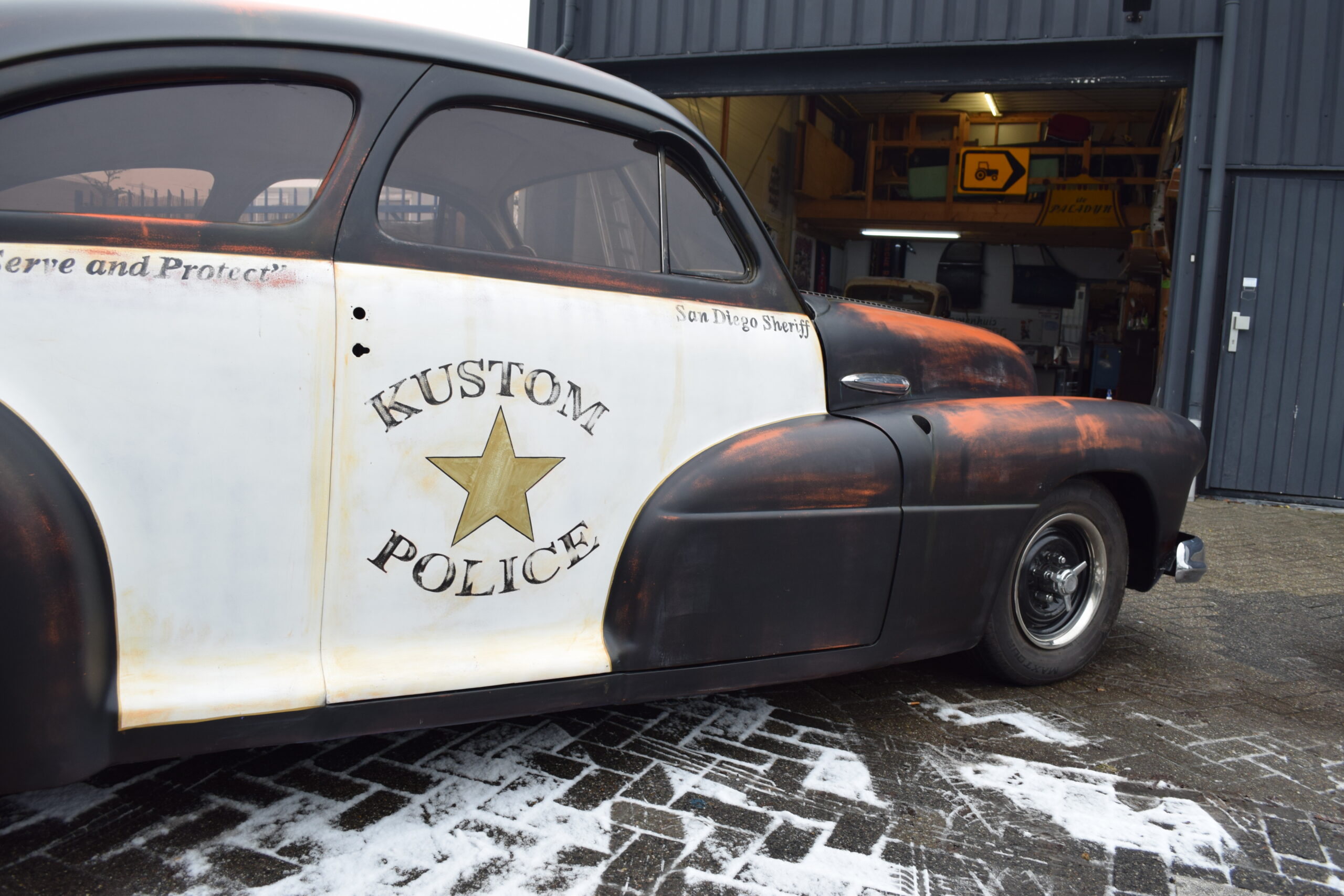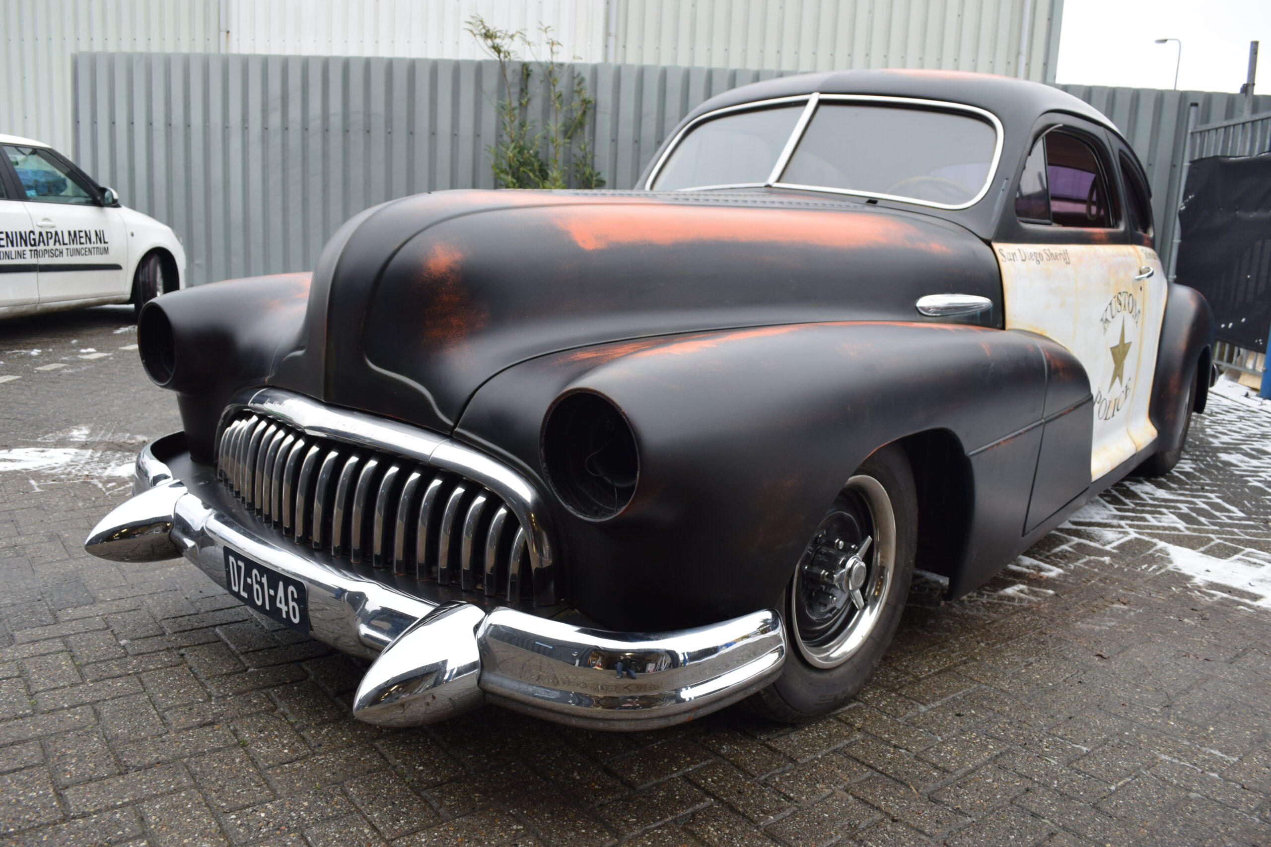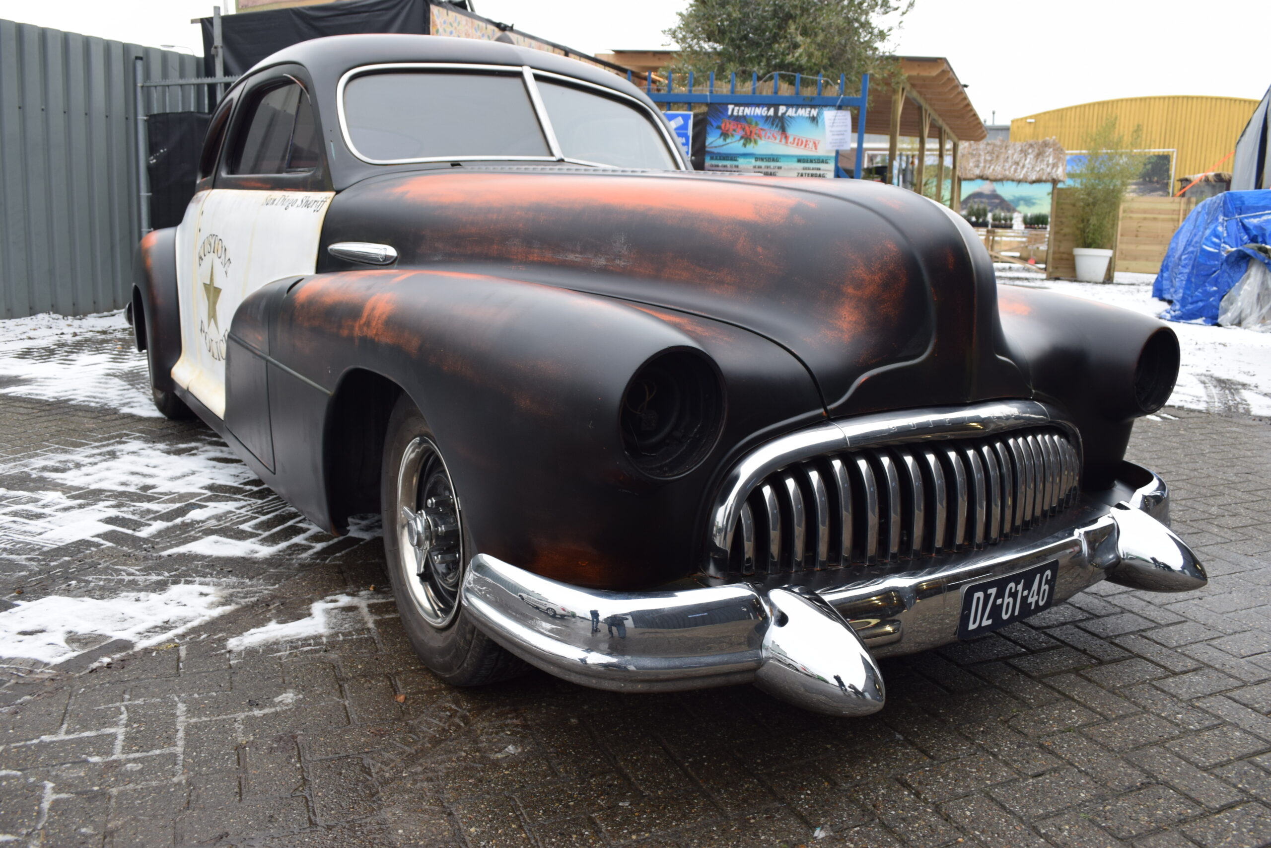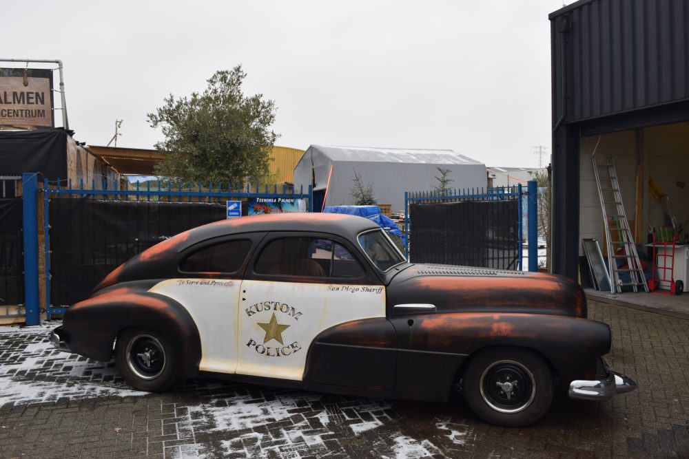 Deze 1947 Buick van USACC uit Veendam had nog een stevig jaren 80 jasje aan. Her en der beschadigd, vervallen en wat gedateerd. De opdrachtgever had een dergelijke auto gezien in California, foto’s gemaakt en de wens uitgesproken de Buick deze look te geven. Maar dan wel met een twist, “maak er maar een politie auto van”. Zijn wens is mijn werk. Zie hier het resultaat.