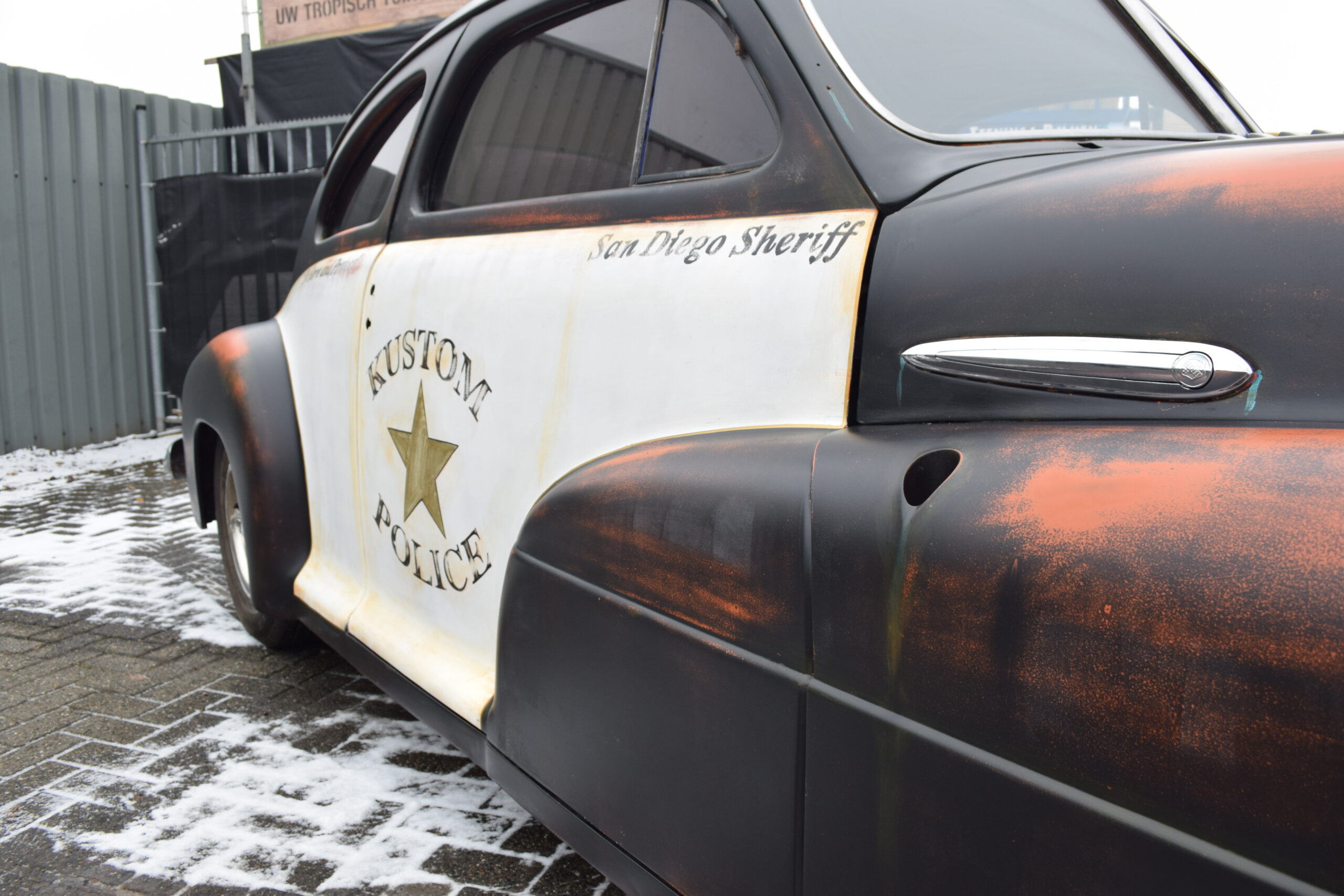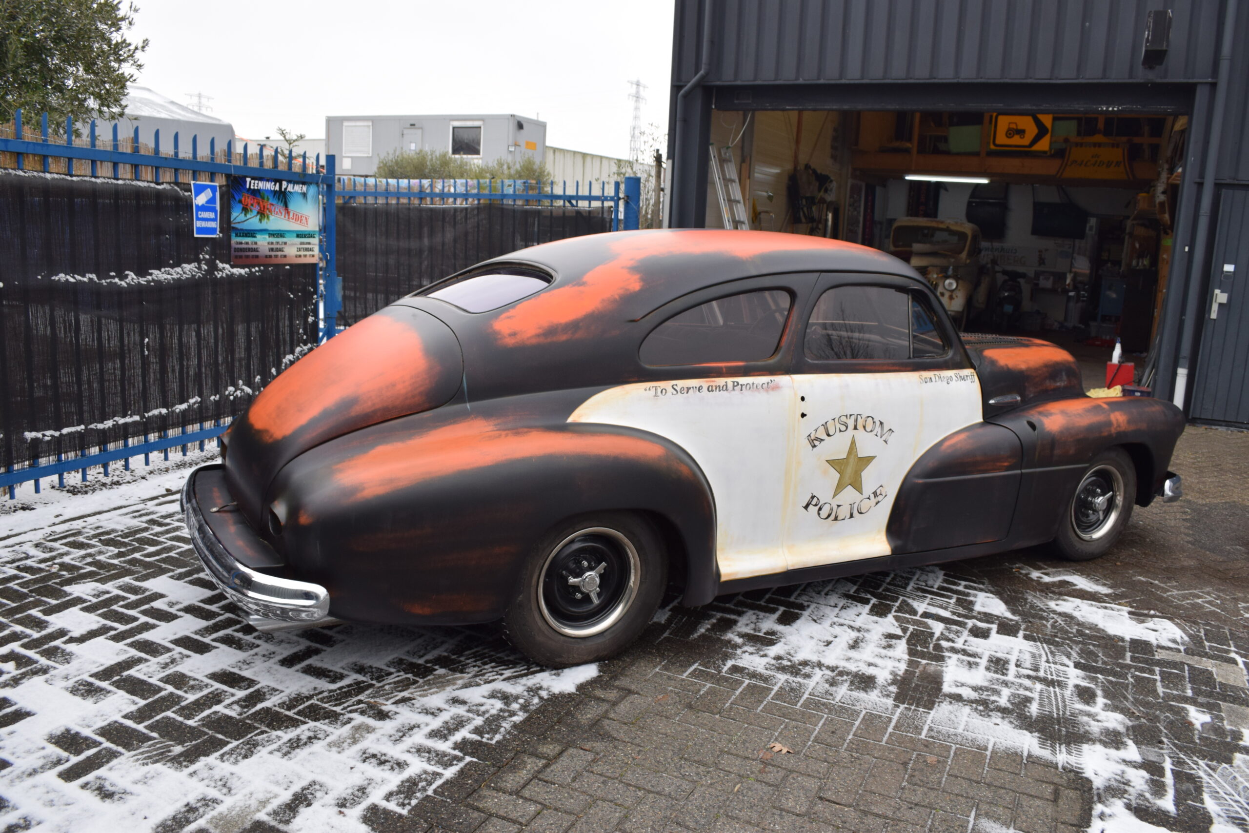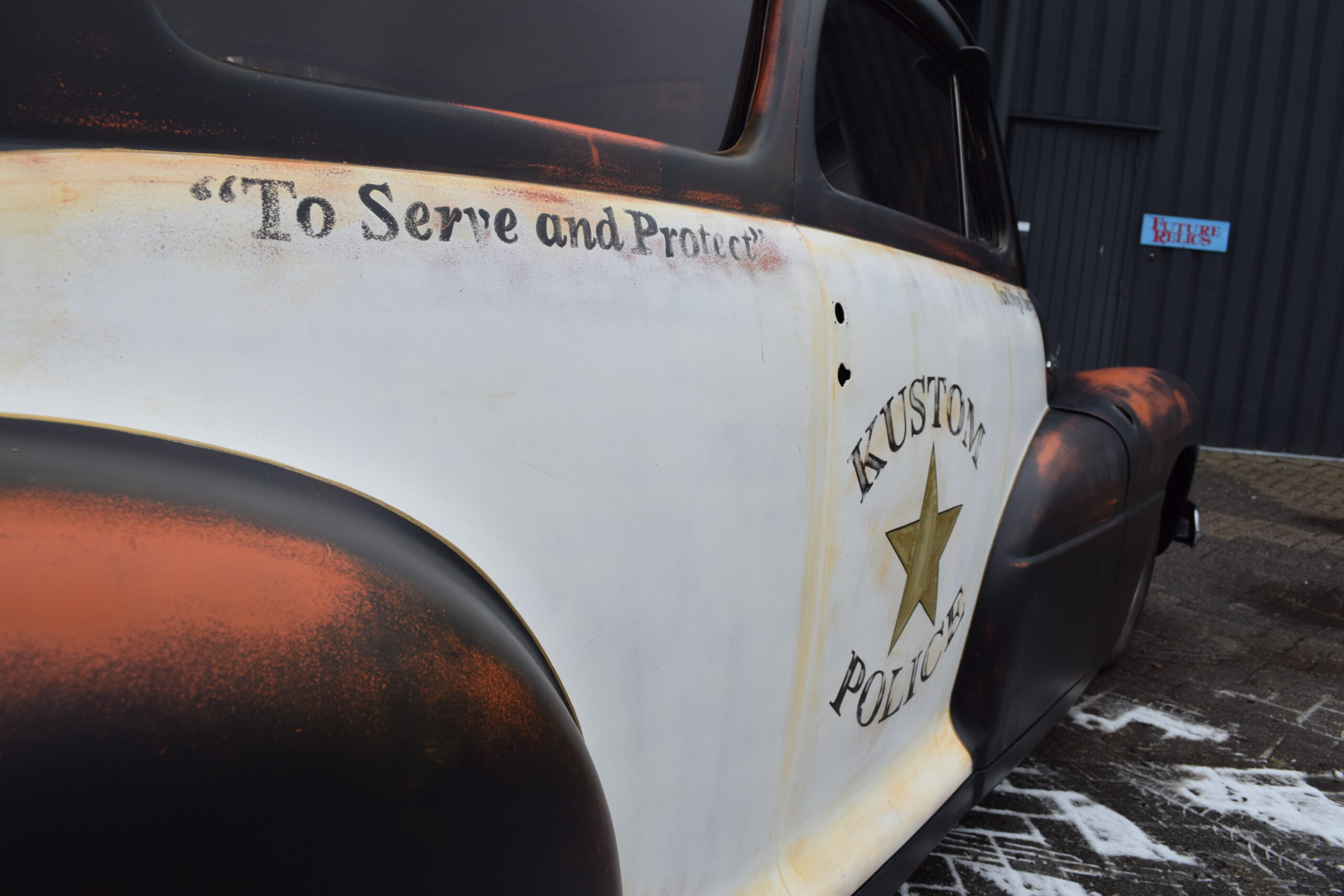 Deze 1947 Buick van USACC uit Veendam had nog een stevig jaren 80 jasje aan. Her en der beschadigd, vervallen en wat gedateerd. De opdrachtgever had een dergelijke auto gezien in California, foto’s gemaakt en de wens uitgesproken de Buick deze look te geven. Maar dan wel met een twist, “maak er maar een politie auto van”. Zijn wens is mijn werk. Zie hier het resultaat.