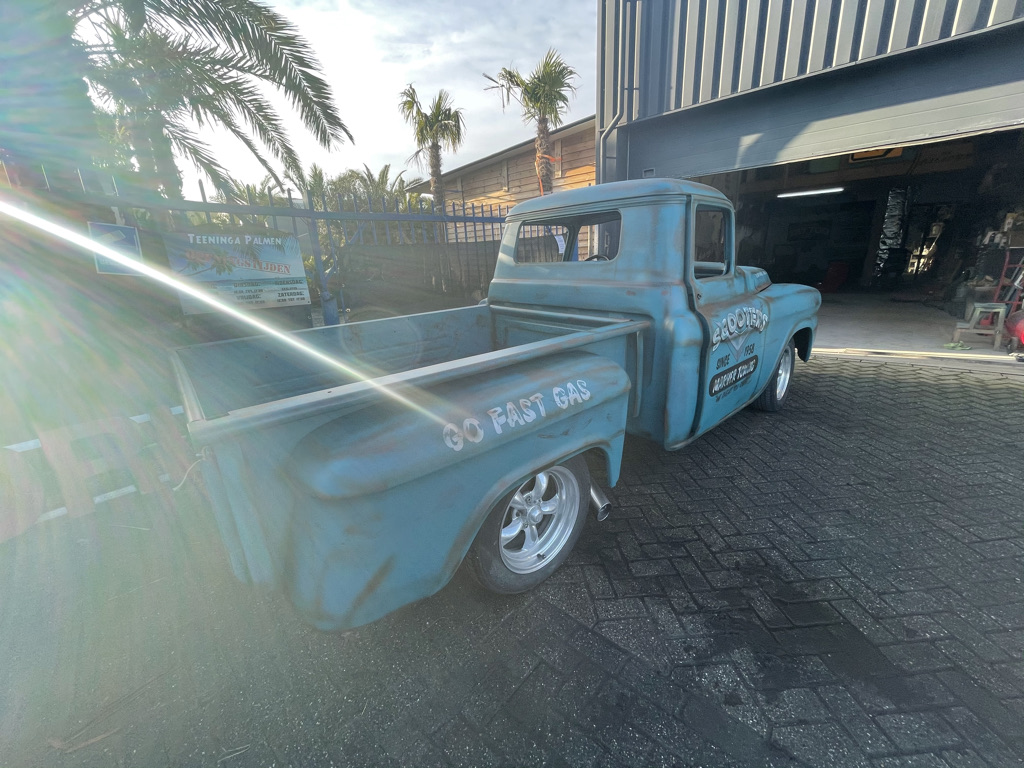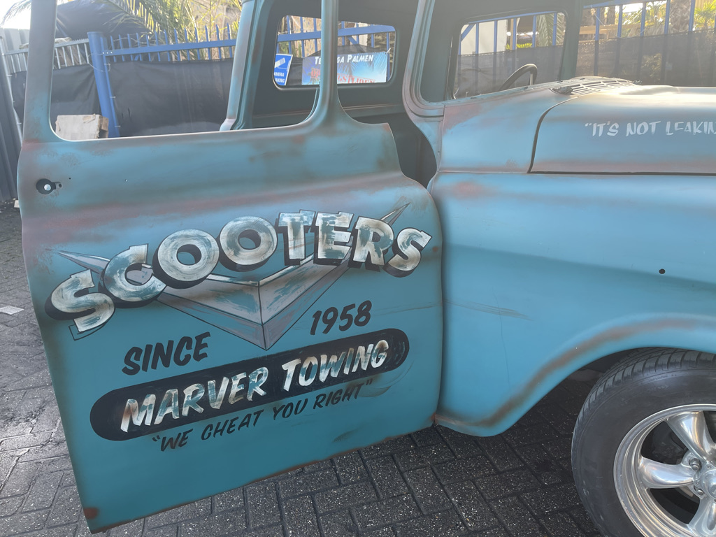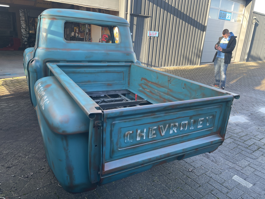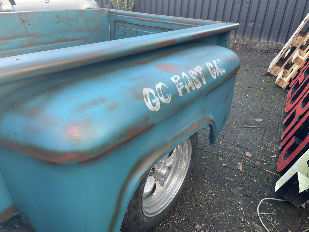 Deze wagen kwam met een beetje laswerk aan, de klant had zelf al veel gedaan. Dit laswerk is allemaal voorbewerkt, en strak gemaakt. Daarna de wagen in de “base coat” gezet en van een patina/rust look voorzien. Vervolgens “in house” ontworpen logos geschilderd en verouderd. Als afwerking hebben we gekozen voor een matte 2K lak, glimmend past niet op een dergelijke look.