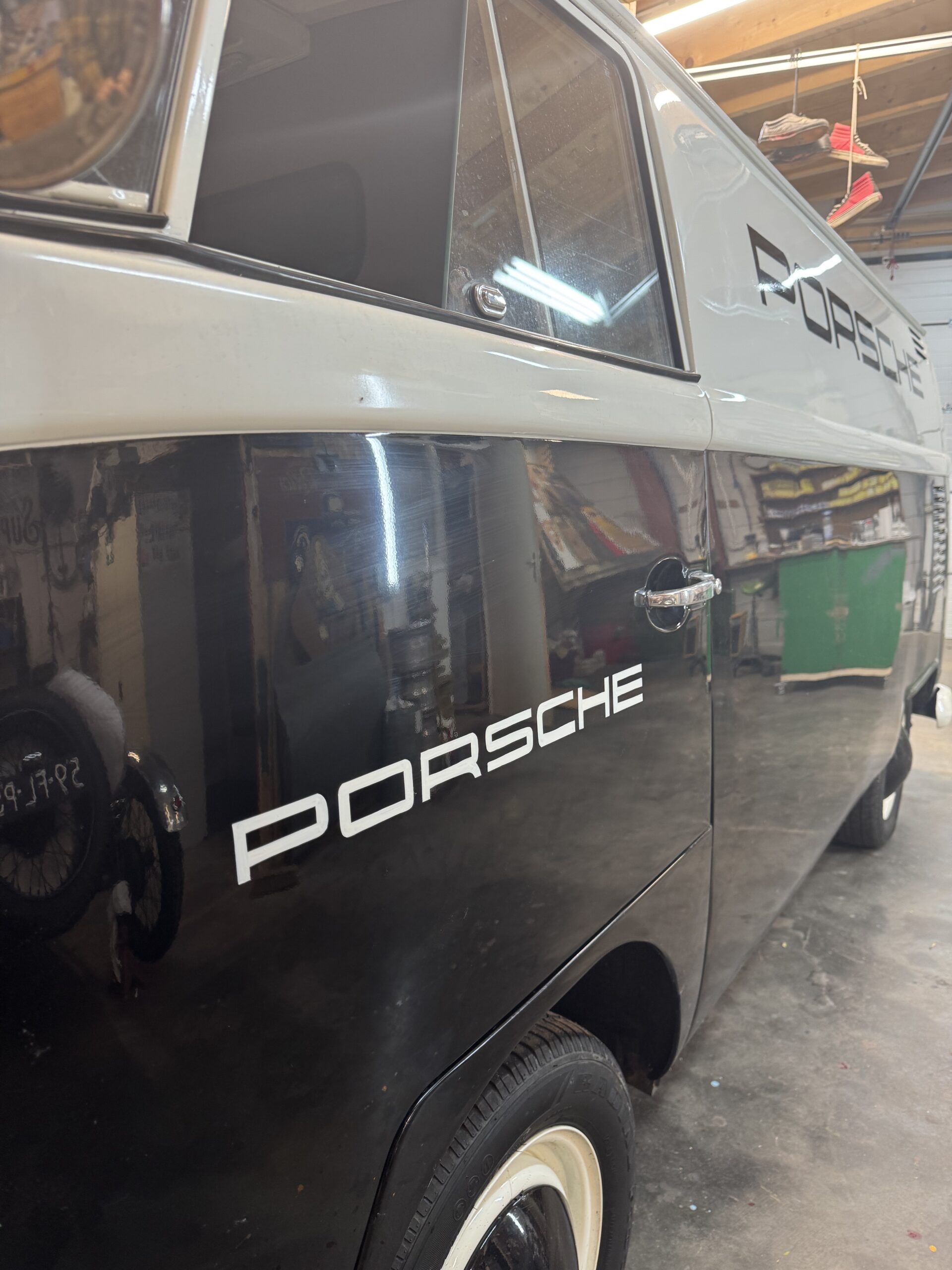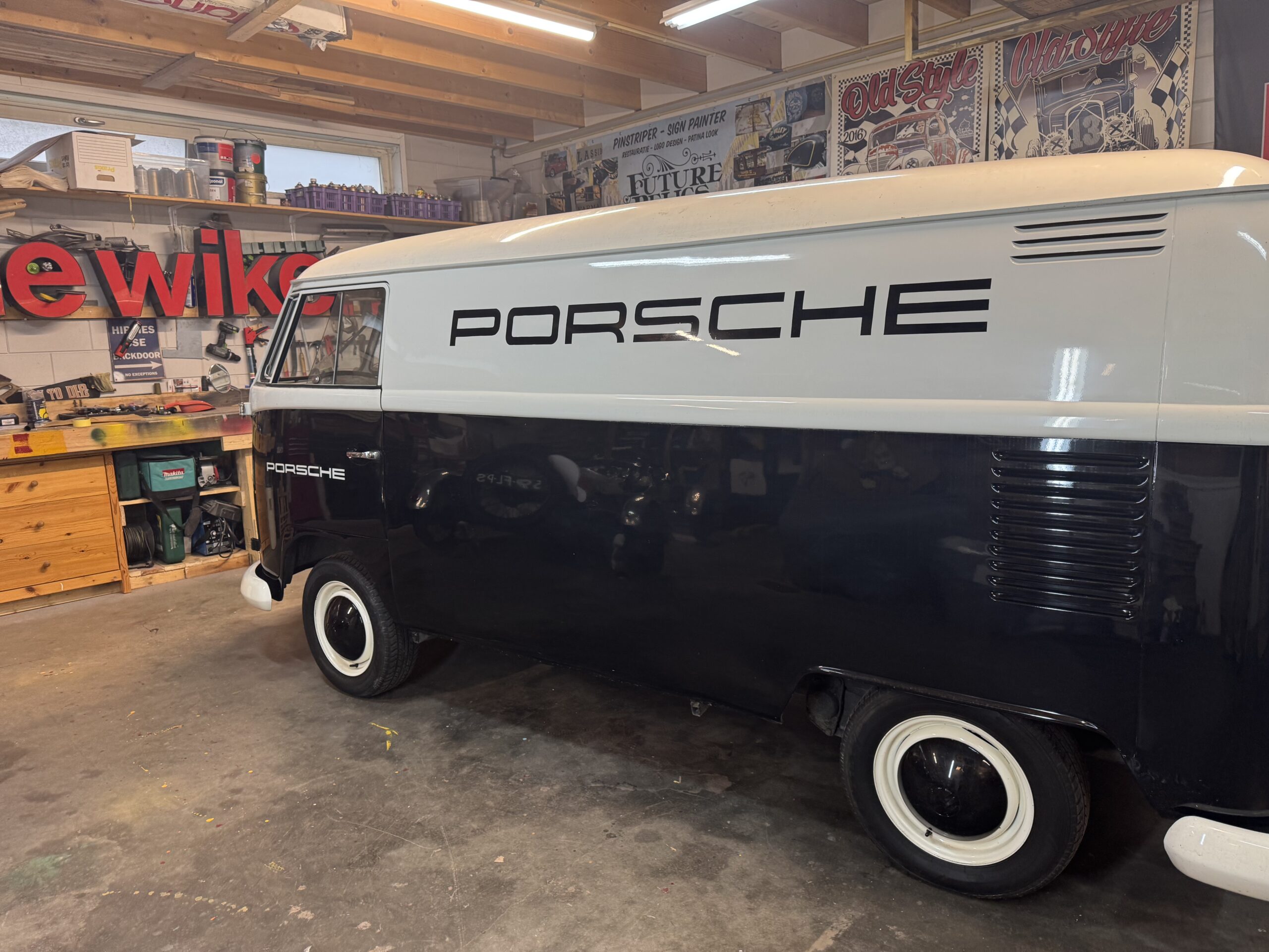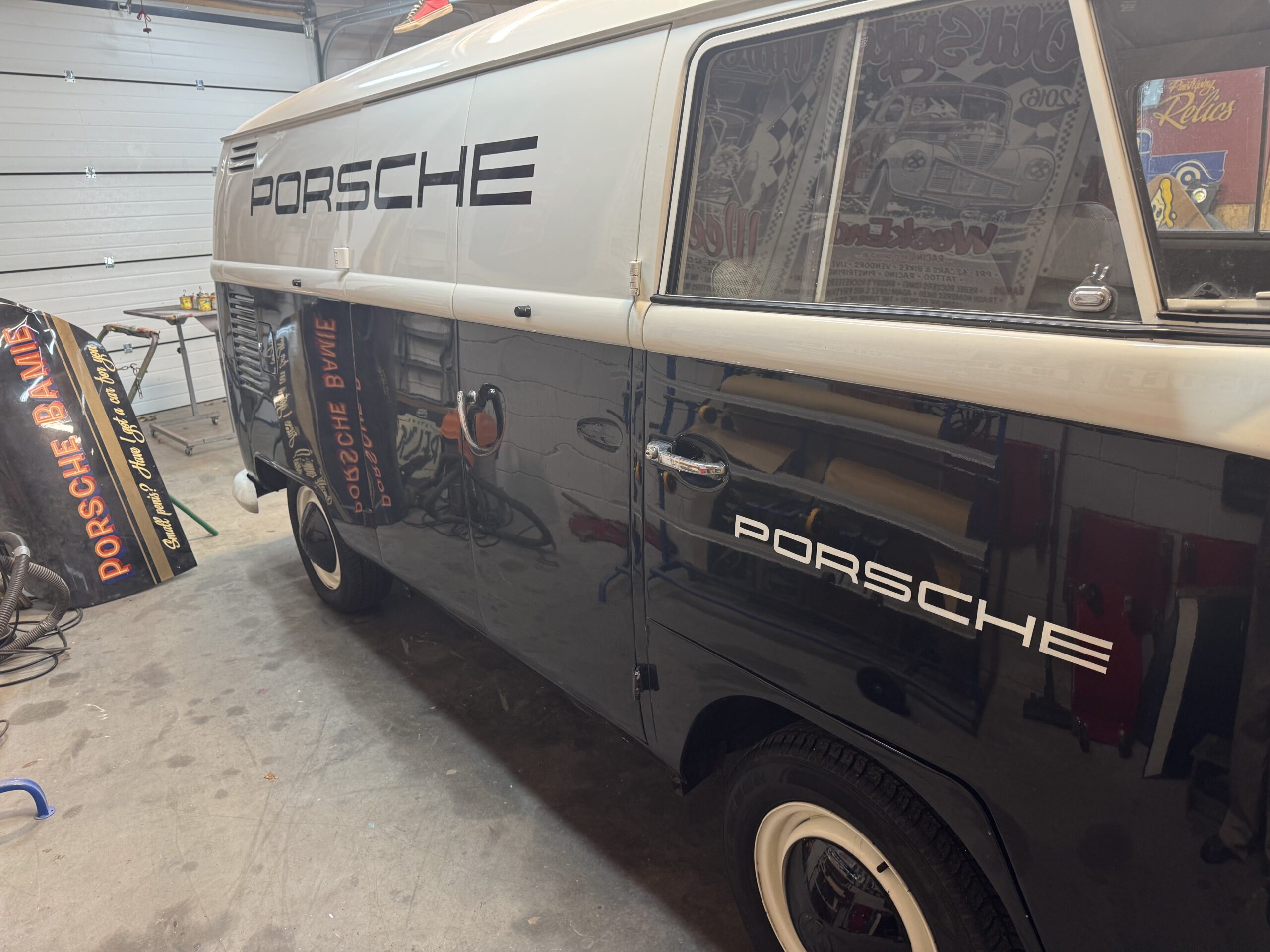 Handgeschilderd Porsche Logo op Klassieke VW T1 Panel Van