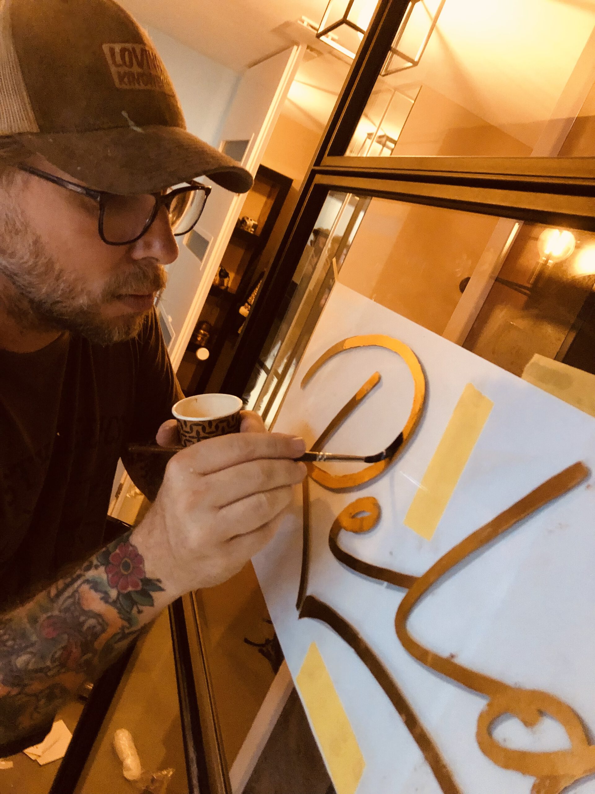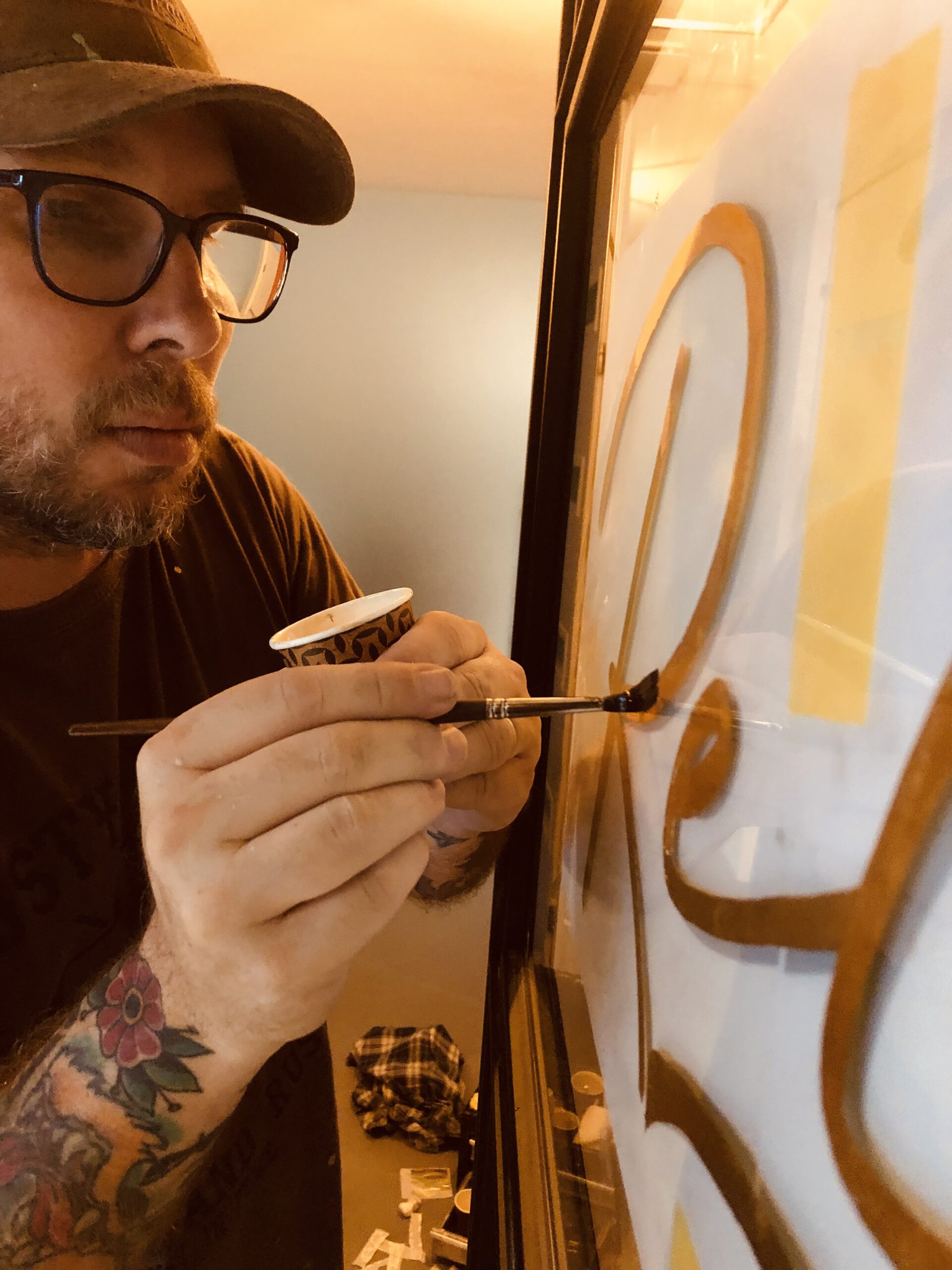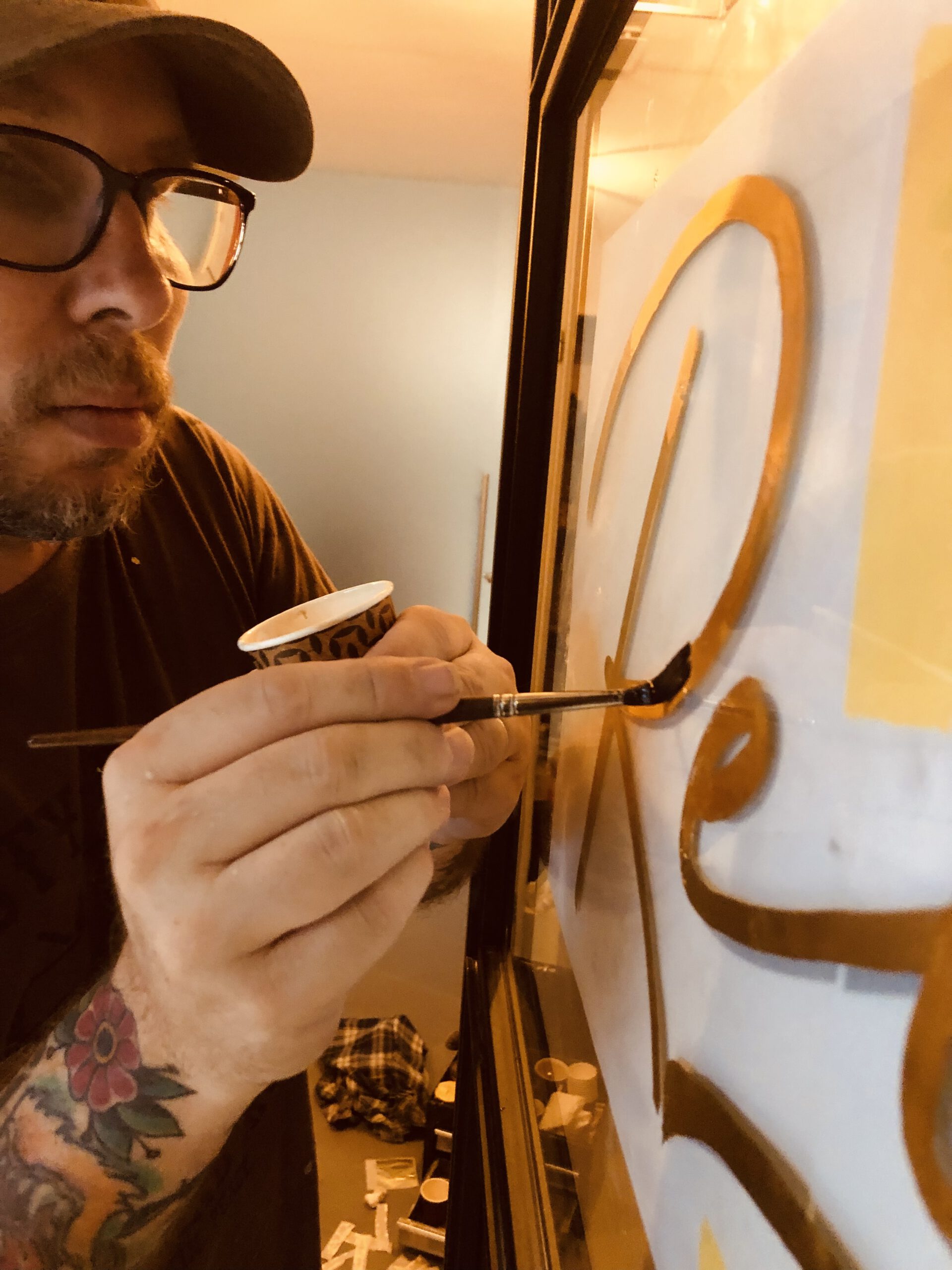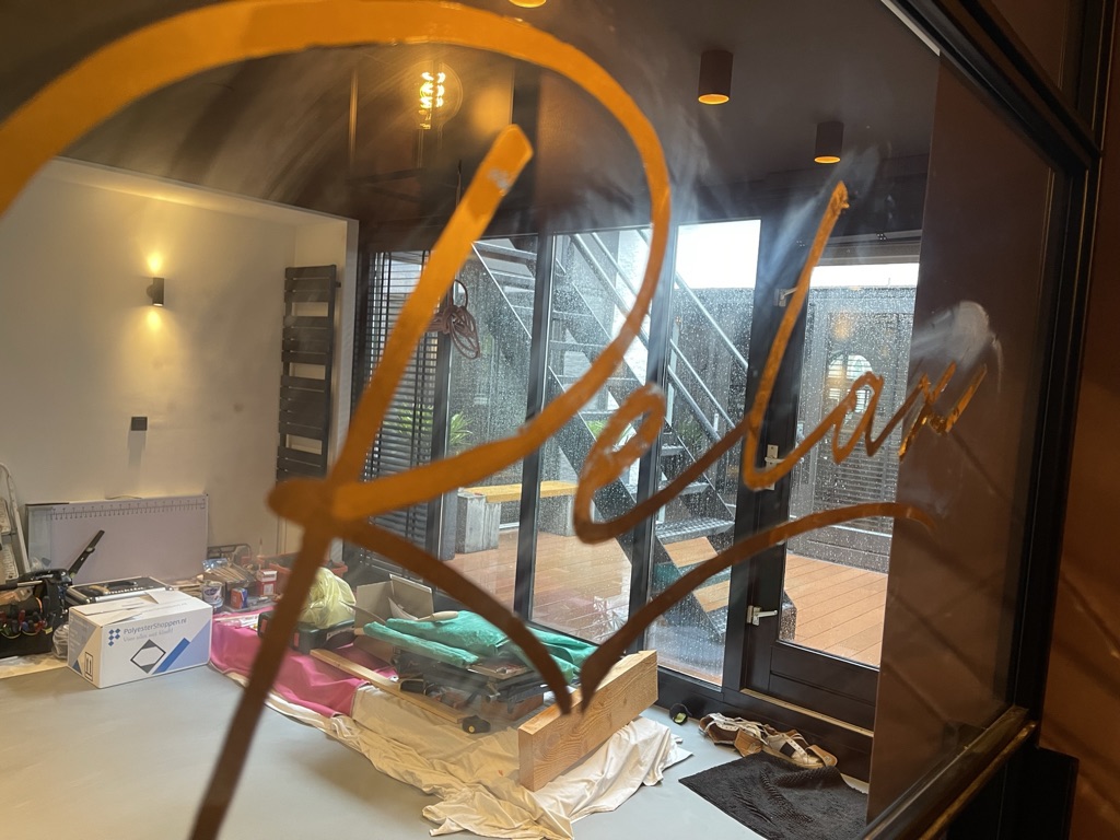 24K Bladgoud aangebracht op een raam, deze is mat afgewerkt op verzoek van de klant. Een uniek en betaalbaar alternatoef voor stickers. Hoe mooi is het om te zeggen dat je 24K goud op je ramen hebt.