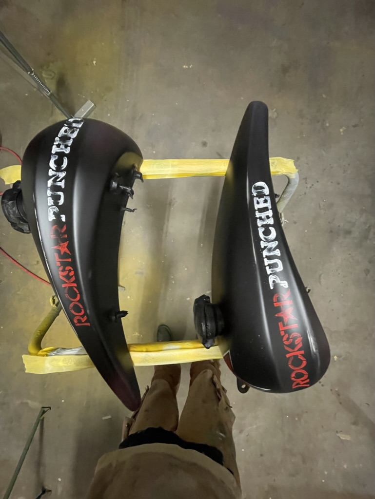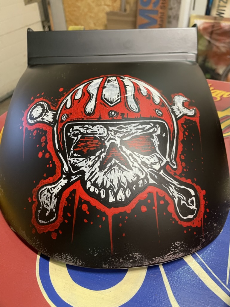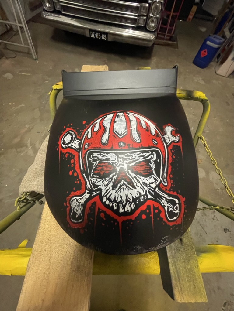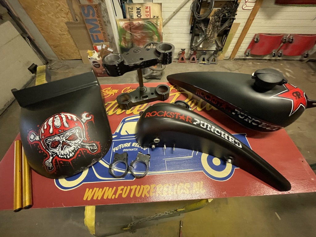 Op verzoek van een klant deze onderdelen matzwart gemaakt, en voorzien van Logos en een schedel met helm. De schedel is niet door mij ontworpen, deze werd aangeleverd door de klant. Geheel licht verouderd en afgewerkt met een matte 2K lak.
