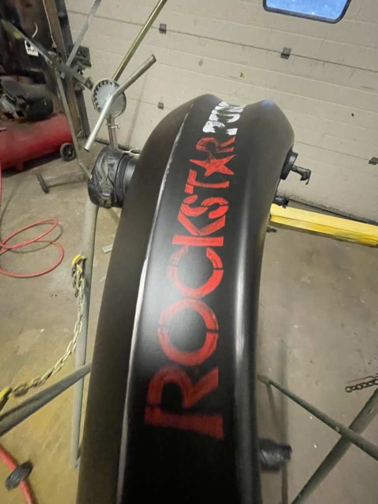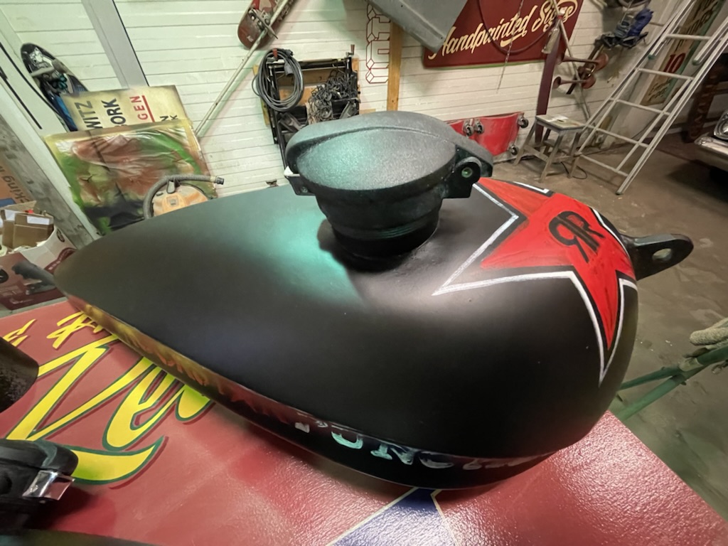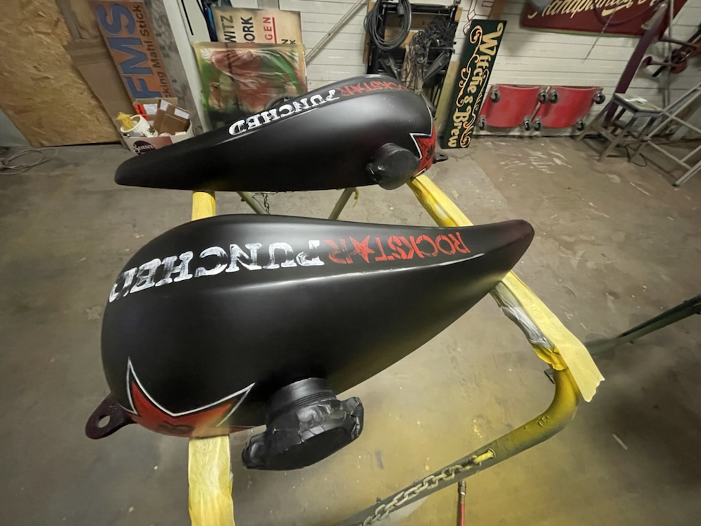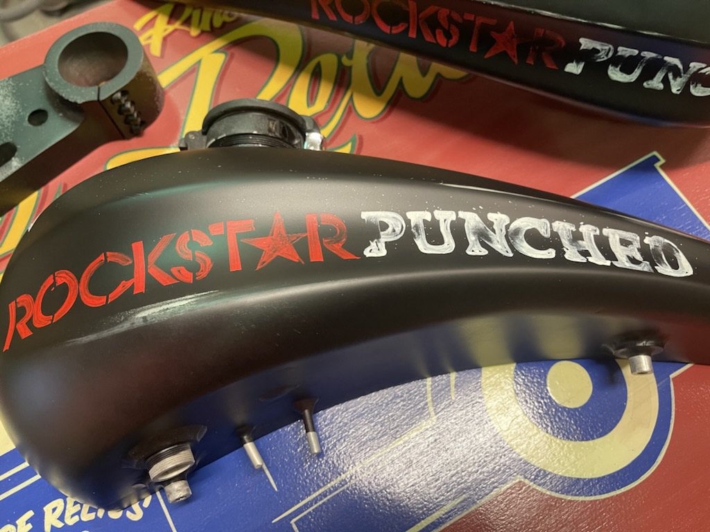 Op verzoek van een klant deze onderdelen matzwart gemaakt, en voorzien van Logos en een schedel met helm. De schedel is niet door mij ontworpen, deze werd aangeleverd door de klant. Geheel licht verouderd en afgewerkt met een matte 2K lak.