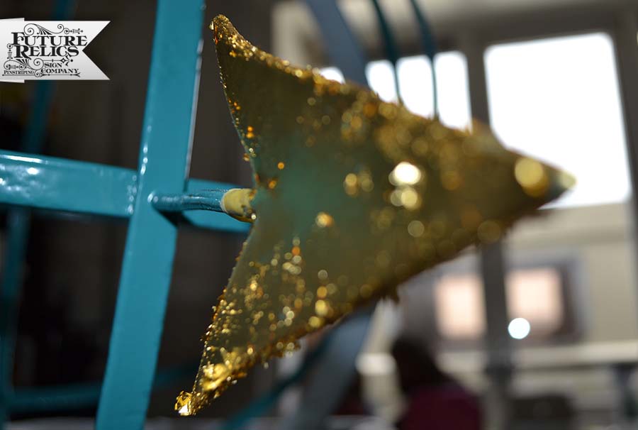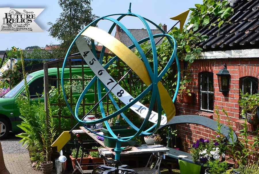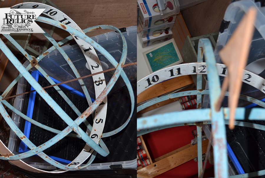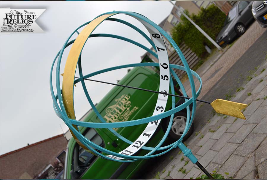 Werkzaamheden: Restauratie verfwerk. Ontroesten, primer, voor en aflakken enz. Handgeschilderde nummers en decoratie Bladgoud Terugplaatsen Zonnewijzer