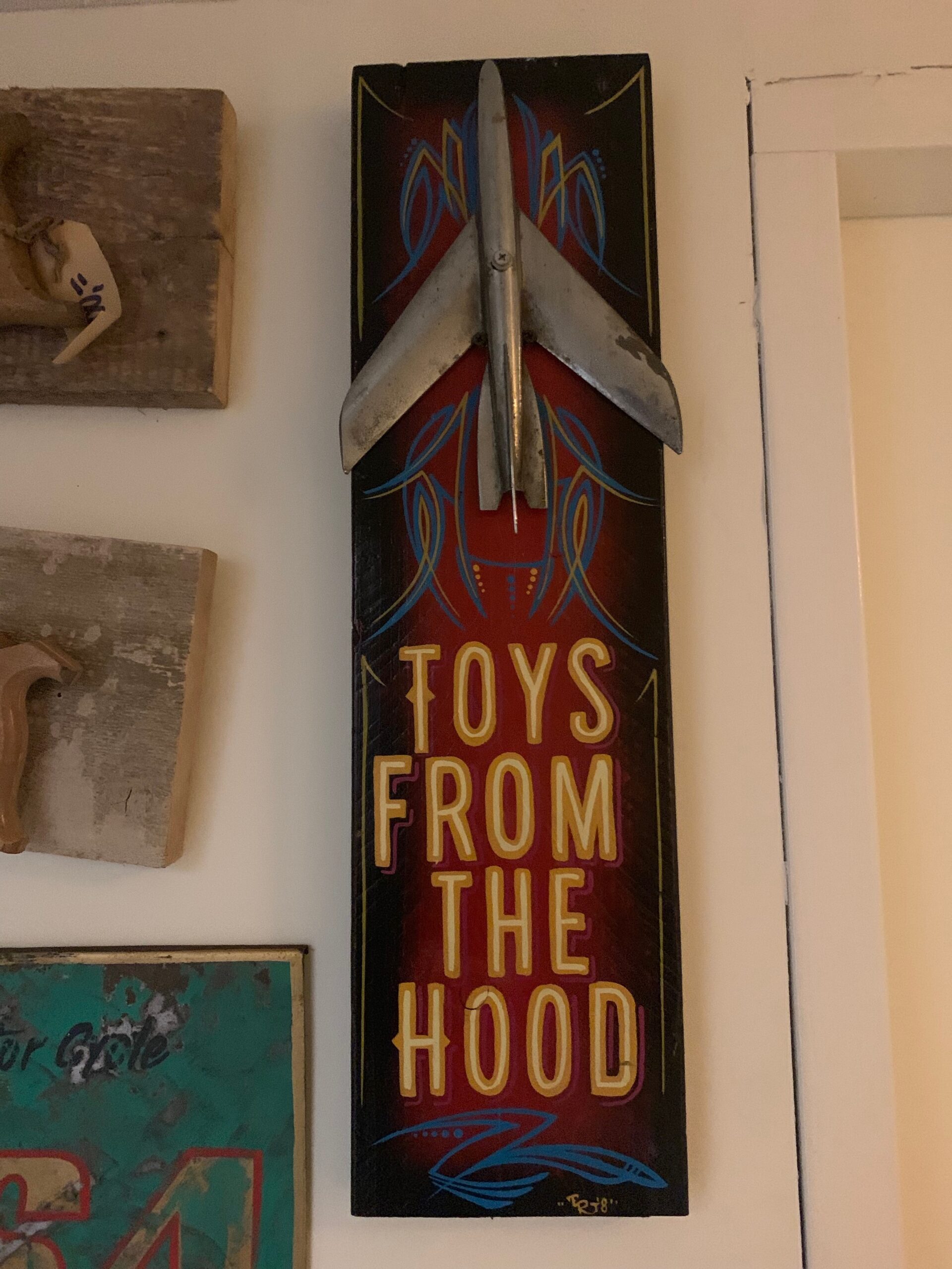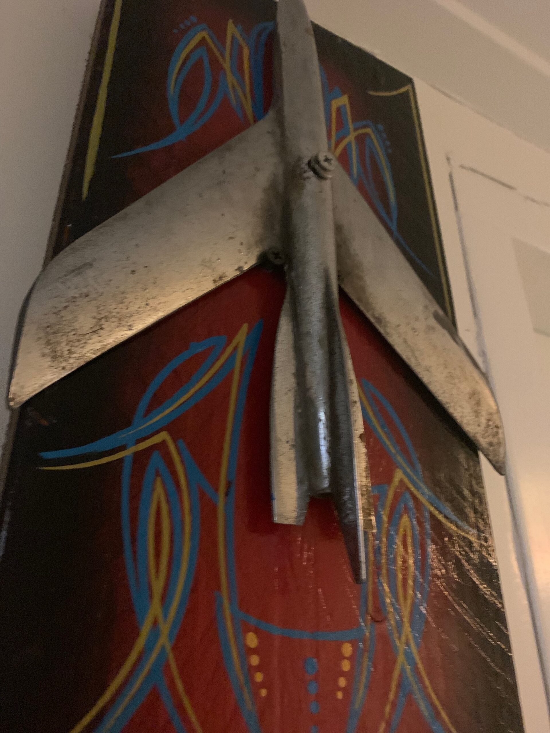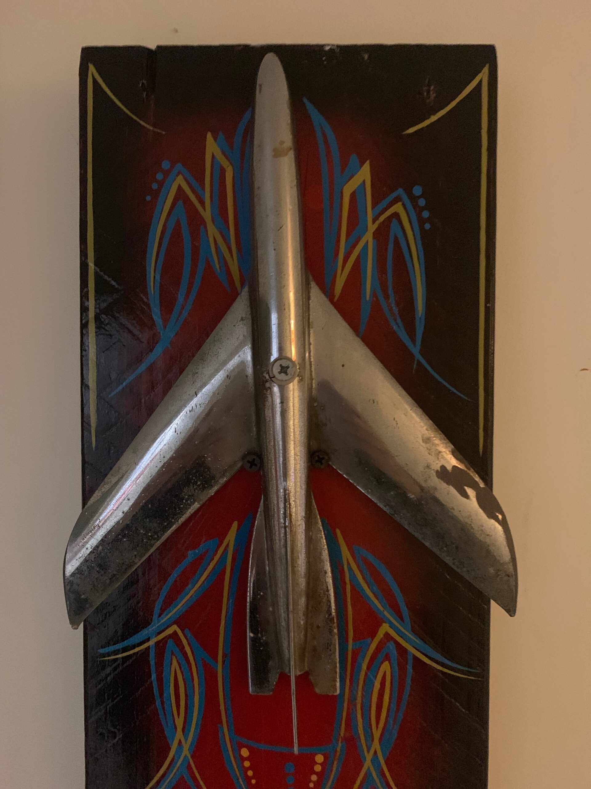 Een vinrage 50`s hood ornament op een dikke plank voor aan de muur.